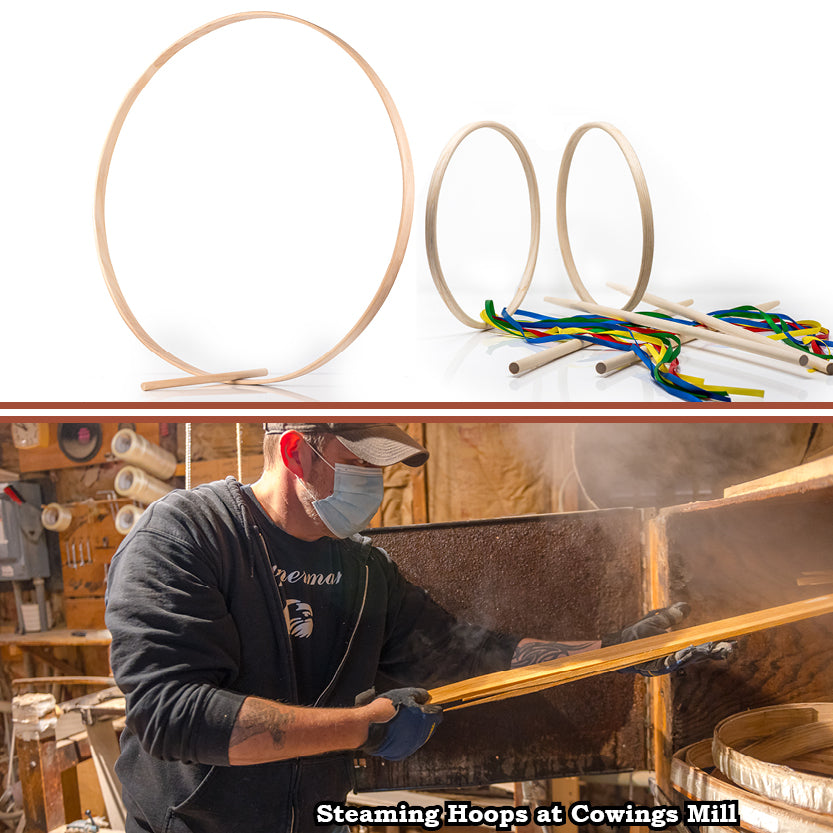 Rolling, racing, and tossing hoops is a childhood tradition the world over. These games were popular in early America and are still popular today, even as the game rules and hoop materials change over time. We bend the hoops for our historical toys and games here at our Vermont shop in the traditional way, steaming green lumber cut into slats from local trees and bending it to form our solid wood hoops.